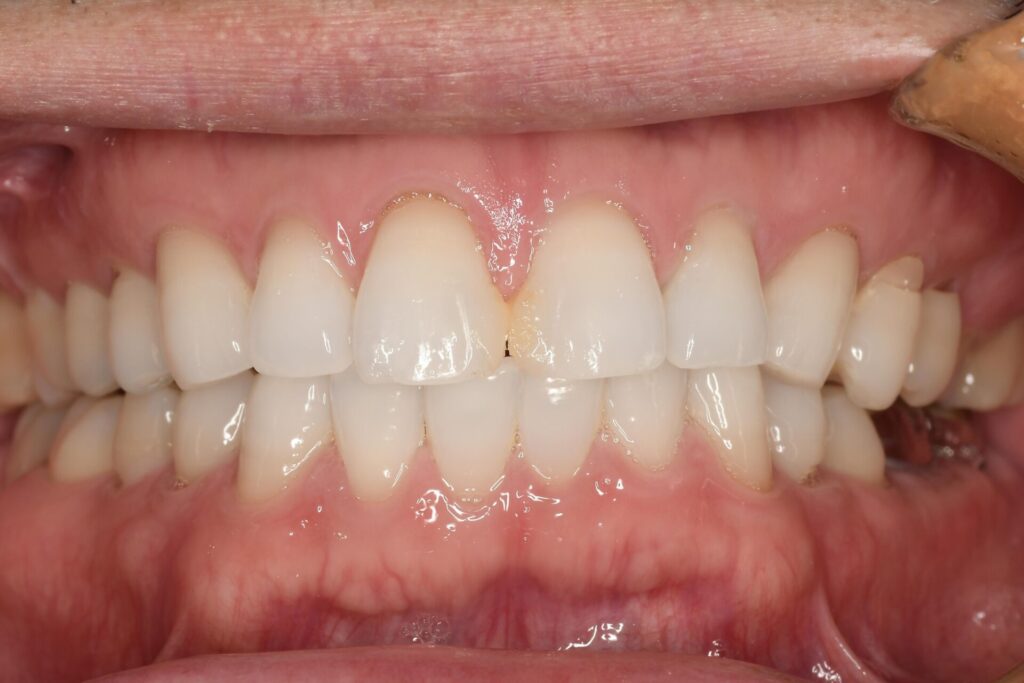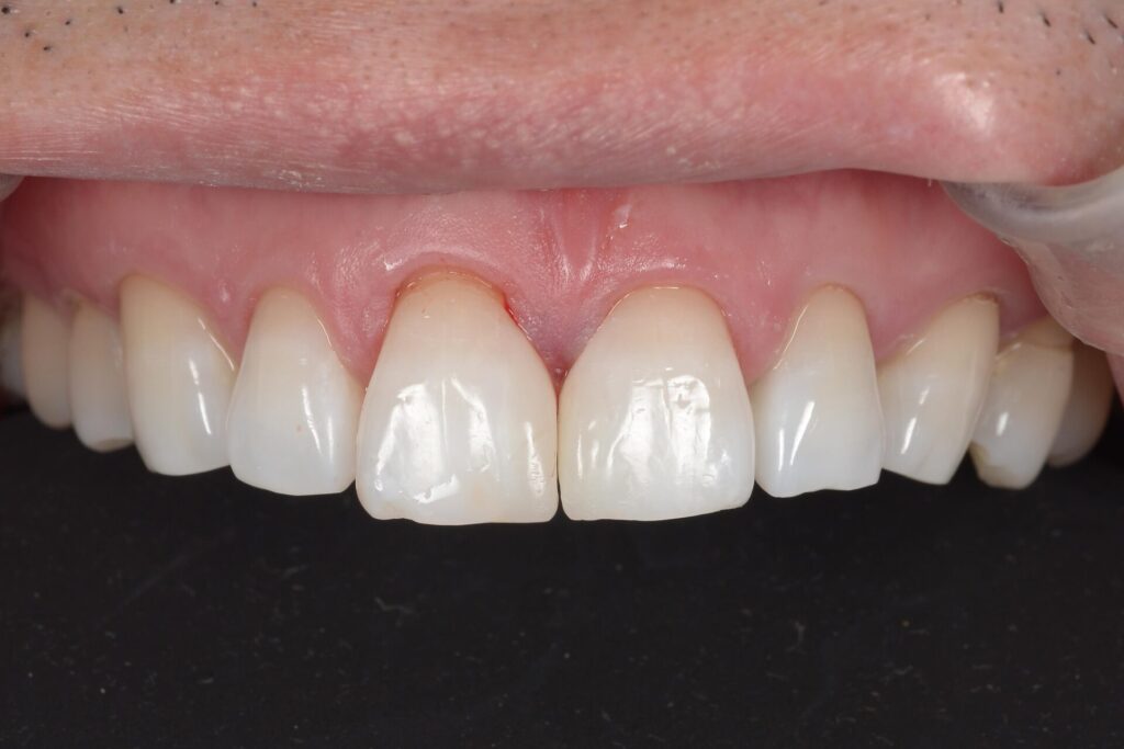 正中に古いコンポジットレジン修復(詰め物)があります。形、色ともによくありません